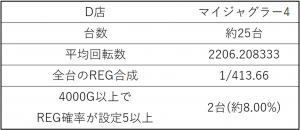 D店は全体の回転数が多いわりに高設定ぽい台が少ないです。複数の路線が乗り入れている駅がすぐそこだから高稼働だったのでしょうか。数値を見ると、設定状況は厳しいだろうと予想されます。