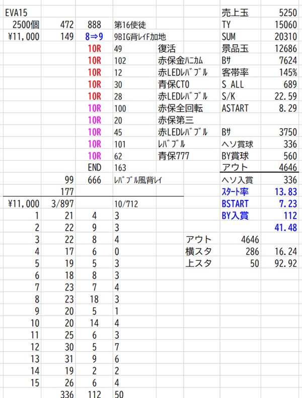 おっと、2万円使った時点で456回転も回ってんぜ。こりゃ凄い1日になりそうだなって思うが、実際には横スタ、上スタとも大したことはない。何が良いかというとポケットの入賞率だな。朝釘を見た時ポケットの釘調整がすこぶる良いと思ったから安心してたけど元ゲージとあんまり変わらんっていうくらい良い。21000円目にパタ青から第16の使徒。白文字だったんで期待薄なんですけど、発展する時の台詞がいつもと違うんで熱そうにも思える。これが888と揃ったけど単発。時短中に何もない。