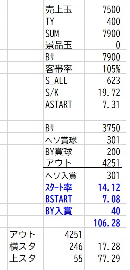 6末に自分が打った台の回転率。勿論今日遊技した台の左隣ですけどBY入賞率は1/106.28となっています。だからこの台もその日は多分1/100くらいでしか入ってないはずだと思うし、もしかしたら1/100どころか1/140くらいしかダメだった可能性はある。多分スタート率はそんなに変わってないと思うんでスタート率が1/14でBY入賞率が1/140だったら、次のようになってます。