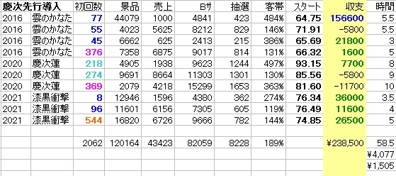 ここで慶次の先行導入については過去3機種の結果を調べてみました。該当する成績は全て、前日から並んだときのものでありますので朝の6時くらいに来たというのは除外してあります。これを見ると単純に実働58.5時間で238500円の儲けですから、時給4077円なのですが、アンドレさん的に言えば並び時間も時給に考慮するということ。この考えでいくと実働は58.5時間に並んだ100時間を加えると158.5時間となり、このときの時給は1505円となっております。