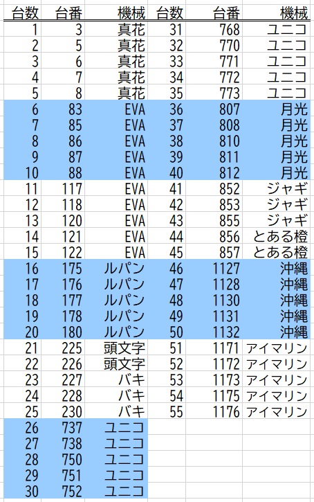 上の画像は順番に6月1日、6月11日、6月18日の結果である。これを見ていて気が付くのは、真花、EVA、ユニコ、沖縄は3回とも対象になっているのである。ならばこの4機種に的を絞れば良いかというとそうでもない。沖縄は非常に分が悪い遊技機だ。店の一番奥に配置されておりしかも沖縄は88台の内5台若しくは10台という割り振りである。44台中5台しか対象にならないのであれば、その5台を探すのはすごく骨が折れるだろう。しかも入り口から離れた位置に置かれているので、私は今回は沖縄を捨てることにした。狙いは