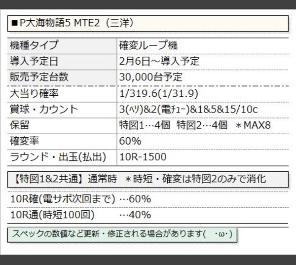 大海5⇒大当たり1/320、確変率60%、出玉1340~未定