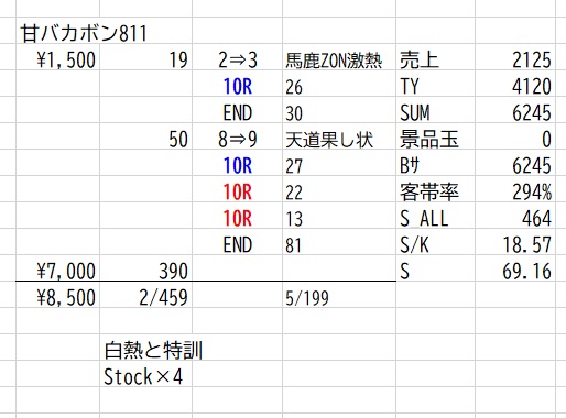 うーん。スタートが6.9なら打てないことはないけれど、もうちょっと回るバカボンで深追いしてみたいっす。いっこ賞球で20/Kとか21/Kを望んだらアカンというのは分かるけどこの台はスペックが甘い割には勝率が低い。つまり勝つ時に勝ちの金額がズッコーンと膨れ上がるので、みんな甘い甘い甘いと騒ぎ立てますが、実際には負ける度合いも大きい遊技機です。1日に2回くらいしか神は取れないと思いますね。そのうちの1回が即死ではかなり厳しい戦いを強いられますが本日はそんな1日。この前打った冬ソナが1.25パチであわや1万円負け。それ以来4倍嵌りを立て続けに食らうし、何となくツカない展開の日ばかりです。