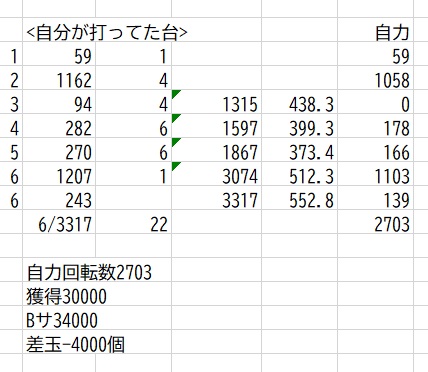 は運が良かったと思った方が良いでしょう。これが全飲まれも有り得るのが確率というもの。期待値を積み上げることよりも、MY意識してヤメることの方が遥かに重要です。私は絶対に最後までは打たないですね。最後の308回転11連がなければこの日は手痛いチョイ勝ちでした。結果論ではなくて常に夕方以降は全飲まれも有り得るという意識でやってますから、4000個のとりっぱぐれなら1万個失う可能性との天秤でセーフ。1255単発が1500嵌り当たらず終わりとか。727回転3連でその後当たらず終わりだとかなり落ち込んで帰る羽目になったことでしょう。MY3万個の試合でしたが、そこから2万個くらいは飲まれてるので危ない試合ですね。