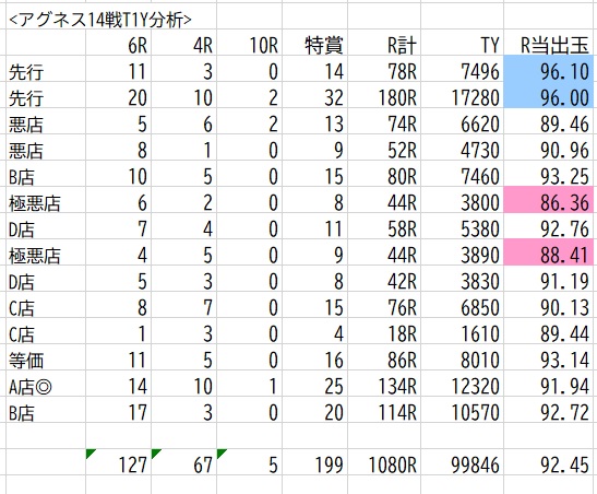 1R当たりの出玉が86.36と88.41は極悪と表記。これ以降その店では二度とアグネスはやりません。