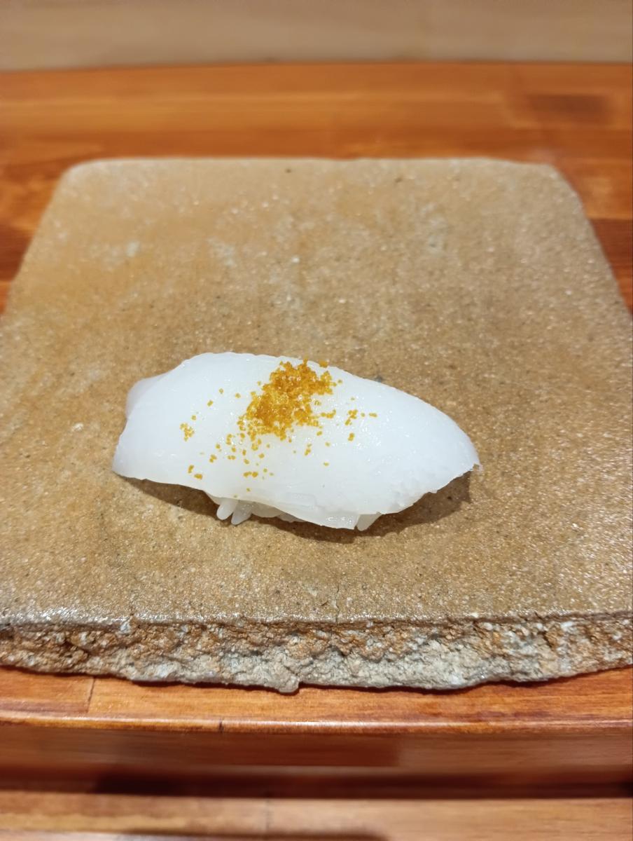この日のマグロは気仙沼。イカの上に掛けられている黄色い粉は何とウニを炒って粉にして塩と合わせたもの!