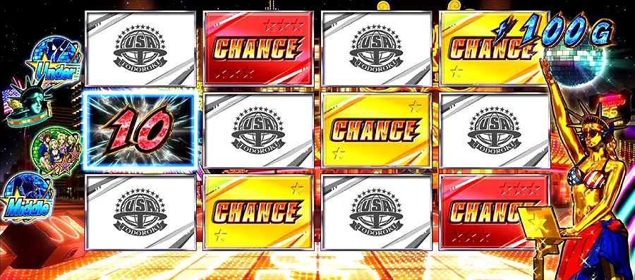 狙え演出発生時は、逆押しでUSA図柄を狙い、停止するほど期待度もアップ。USA図柄揃いやトランクで当選した場合は青7BONUS確定の特典もあります。狙え演出が一度も発生しなければもう1セット継続となり、そこでも狙え演出が発生しなければもう1セット継続=BONUS確定となります。トータルの期待度は約40%。