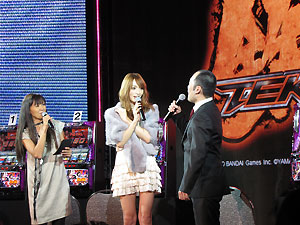 この後、ゲストのパチスロライター陣と、「鉄拳」ファンでお馴染みのスペシャルゲスト・佐藤かよさんによる「鉄拳アタック選手権」が開催。スタートレバーでのゲーム数上乗せ勝負を行ない、佐藤さんも大興奮。「キャラクターが多いのが魅力。いろいろなキャラを選んだり、見たりできるのが面白い」と、魅力をアピールした。