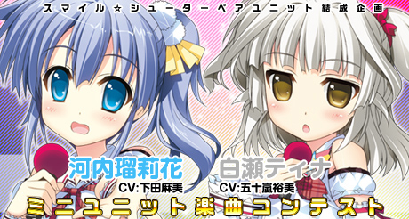 審査・入賞特典:コンテストでの最終優秀作品は、スマイル☆シューター「河内瑠莉花(CV:下田麻美)」&「白瀬ティナ(CV:五十嵐裕美)」のペアユニット楽曲として収録・CD化されます。