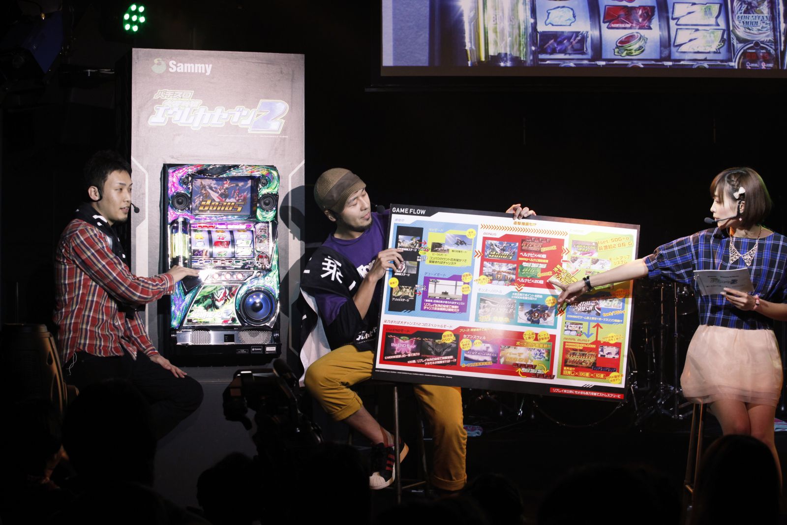 続いて、機種の解説をパチスロライターのマコトさんと松本バッチさんが担当した。本機のスペックの特徴・ゲーム性を司会の南まりかさんを交えて詳しく紹介。マコトさんは「AT機に変わりましたが、前作を意識した作りなのでファンの方も違和感なく遊べると思います。原作のイメージを壊さない演出のバランスがいいですね」と魅力を語った。