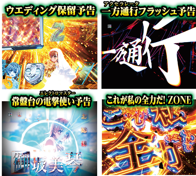 今作の4大演出はどれも発生=超激アツ!! 「一方通行(アクセラレータ)フラッシュ」は変動開始時、「常盤台の電撃使い(エレクトロマスター)」はリーチ後、「これが私の全力だ!ZONE」は御坂美琴VSリーチ中に発生する。
