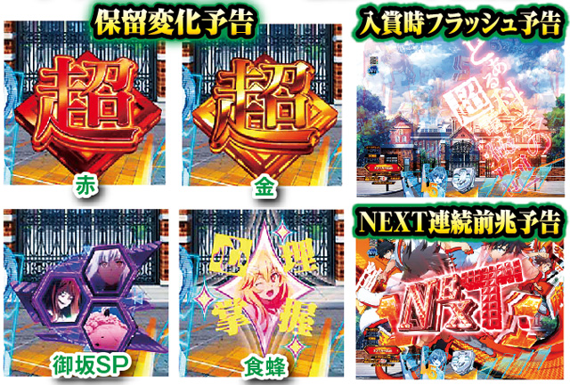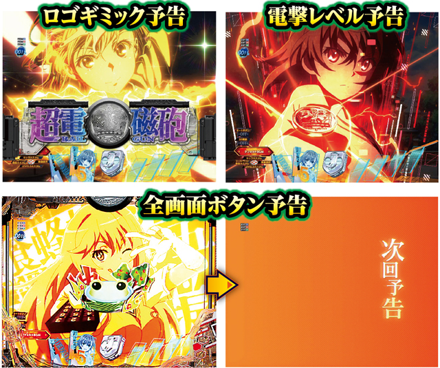 ロゴギミック予告は変動開始時に発生。電撃レベル予告はSU5まで発展したり、色が赤だと期待できる。アツい展開が期待できる全画面ボタン予告は美琴と食蜂バージョンが存在し、前者なら灼熱。またボタン押下時に、金系や次回予告が出現すれば初当たりの期待が一気に高まるぞ。