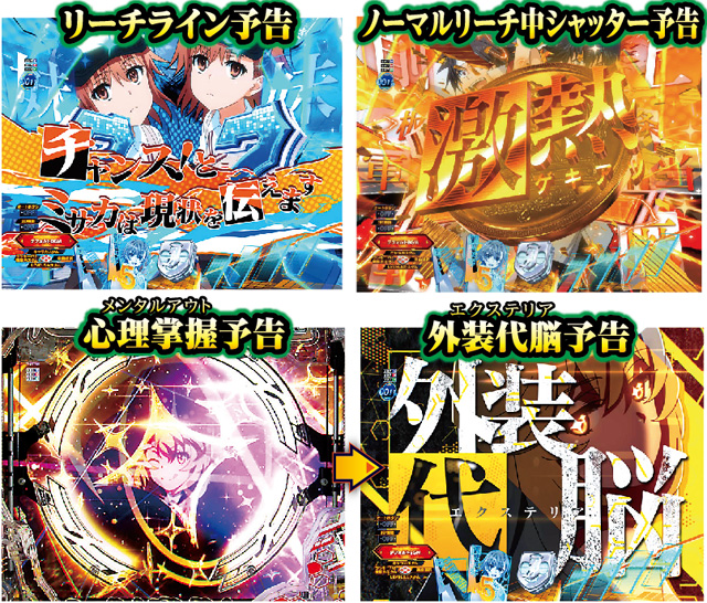 図柄テンパイ時にキャラがセリフを発すると信頼度アップ。心理掌握(メンタルアウト)予告は連続予告や外装代脳(エクステリア)予告への派生が期待できる演出で、チャンスアップをストックする外装代脳(エクステリア)予告につながれば大チャンス!!4大演出の常盤台の電撃使い(エレクトロマスター)予告や、激熱シャッター出現、一方通行(アクセラレータ)が図柄を変化させる「7図柄変化予告」などが出れば灼熱だ。
