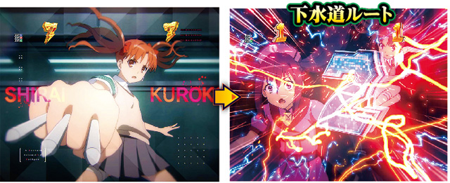 白井黒子と警策看取のバトルが展開する。リーチ中盤に下水道ルートに移行すると信頼度が約85%に急上昇だ。なお。序盤での黒子の金属矢発生時はフリーズ時間が長いほど信頼度アップ。