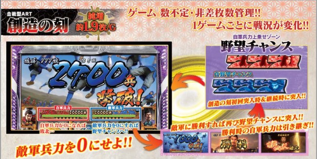 ART中も戦局創造システムが1Gごとに戦況を左右し、「野望チャンス」と「創造の刻」の究極ループを体感できる。
