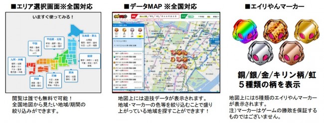 「カチナビ」とは、マイスロ遊技データを元に「エイリやんマーカー」を地図上に表示し、盛り上がっている地域を探すことができるサービスです。