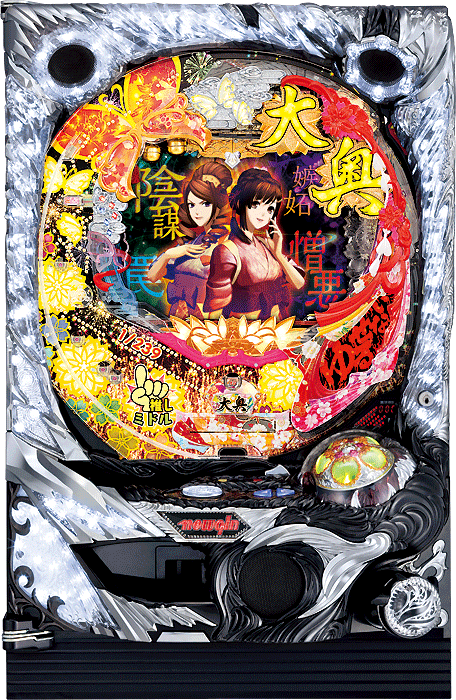 液晶右上から中央に落下することがある大奥ロゴ、中央に飛び出す錠前、多彩に変化するフレーム、左上で揺れる鈴、下部から上昇する女中の各役物を搭載。