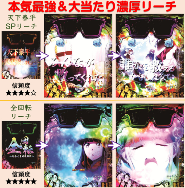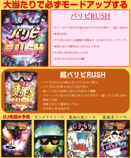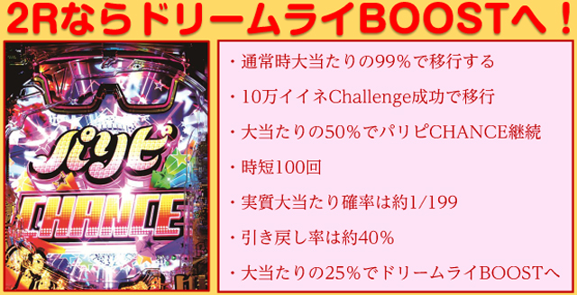 ※パリピCHANCE時 10R(実質10R)通常(パリピCHANCE)…50% 10R(実質10R)通常(超パリピRUSH)…25% 2R(実質2R)通常(ドリームライBOOST)…25% ※パリピRUSH時 2R(実質2R)通常(モードアップ)…25% 10R(実質10R)通常(モードアップ)…75% ※超パリピRUSH時 2R(実質2R)通常(超パリピRUSH)…25% 10R(実質10R)通常(超パリピRUSH)…25% 10R(実質10R)通常(ドリームライBOOST)…50% ※ドリームライBOOST時 2R(実質2R)通常(ドリームライBOOST)…25% 10R(実質10R)通常(超パリピRUSH)…75% |