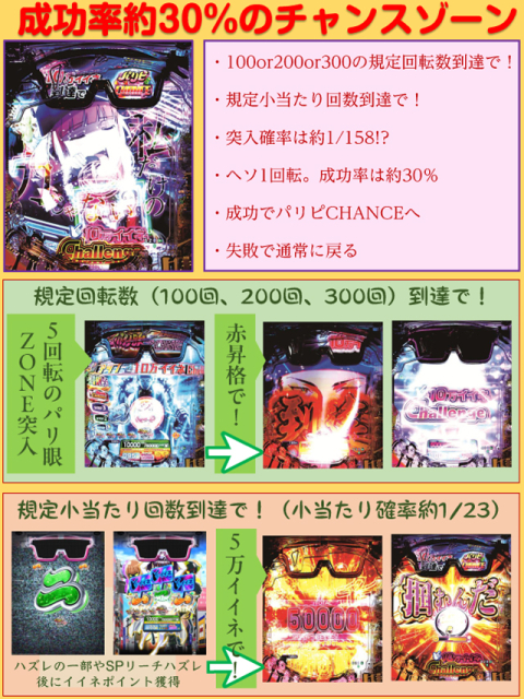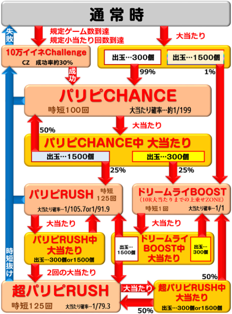 規定ゲーム数経由→成功(パリピCHANCE)…約12.8% 規定小当たり回数到達経由→成功(パリピCHANCE)…約25.0% 2R(実質2R)通常(パリピCHANCE)…約61.6% 10R(実質10R)通常(ドリームライBOOST)…約0.6% ※特図1大当たりとCタイム成功の合算値 |