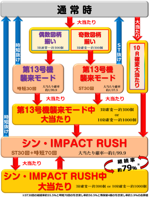 3R(実質3R)確変(ST30回+時短70回)…約50% 10R(実質10R)確変(ST30回+時短70回)…約50% |