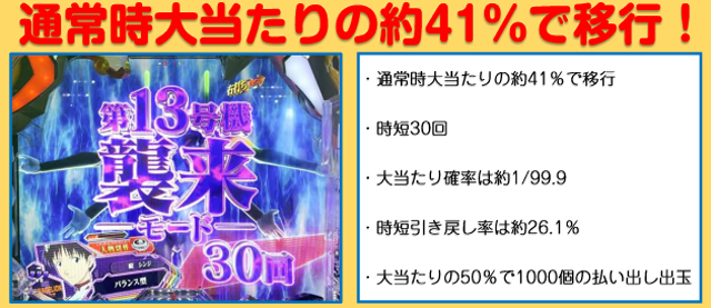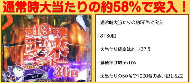 3R(実質3R)通常(時短30回)…約41% 3R(実質3R)確変(ST30回)…約58% 10R(実質10R)確変(ST30回+時短70回)…約1% |