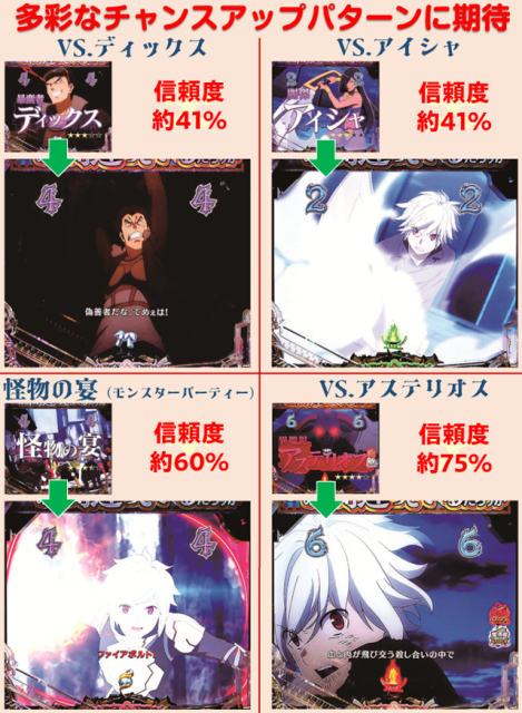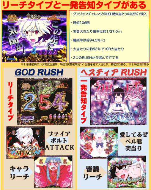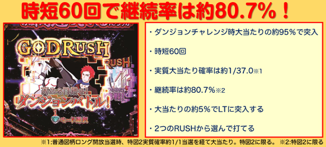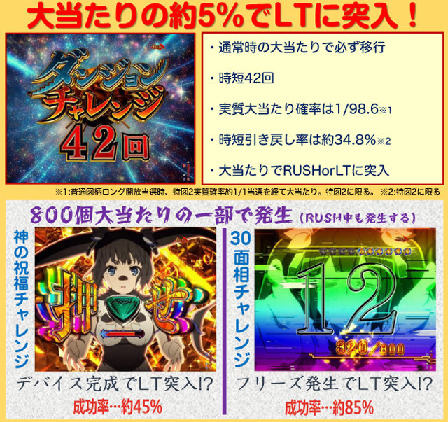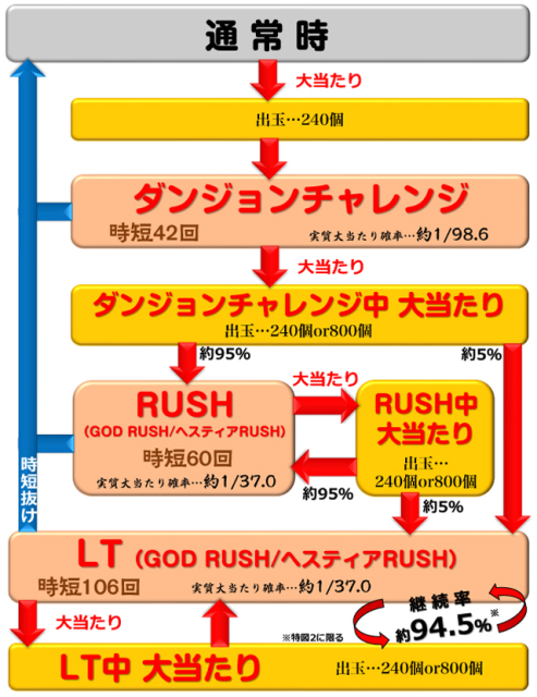 | 3R(実質3R)通常(時短42回)…100% | ダンジョンチャレンジ/RUSH中 3R(実質3R)通常(時短42回)…約48% 10R(実質10R)通常(時短60回)…約47% 10R(実質10R)通常(時短106回)…約5% LT中 3R(実質3R)通常(時短106回)…約48% 10R(実質10R)通常(時短106回)…約52% |
