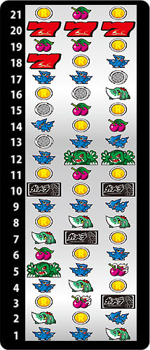 左リール枠内に7に挟まれたチェリーを狙い、枠内にギロンがスベってきたときのみ中&右リールにギロンをカバー。