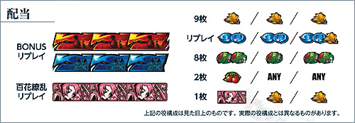 ●百花繚乱ラッシュ……7揃いなどが発生すればゲーム数を上乗せ、突入契機は桃色BAR揃いやボーナススタート時