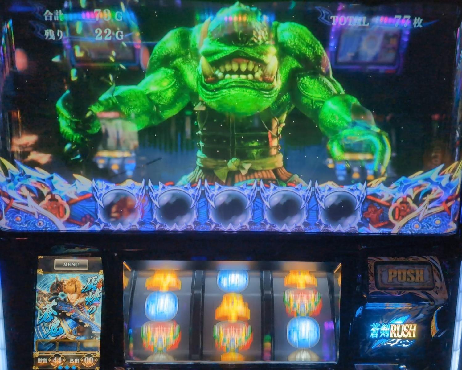 設置台数が減ってきていますが、チャンスがあればまだまだ打ちたい新鬼2。そろそろ緑ガッチャでスイカを揃えたいし、鬼ガチチャンスでリーチ目を引きたい!