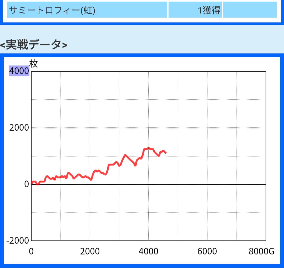 ロンフリやハイエボモード等の出玉トリガーには恵まれなかったのですが、見せ場といえば虹トロフィーが出た瞬間でしょうか。