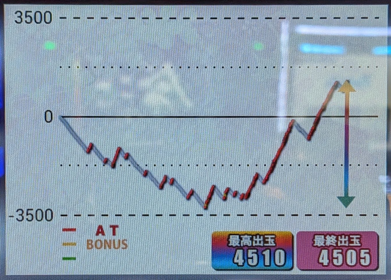 今回は弱かったですね。実戦序盤の周期が深くて、ATを伸ばせなかったのが大量投資に繋がりました。