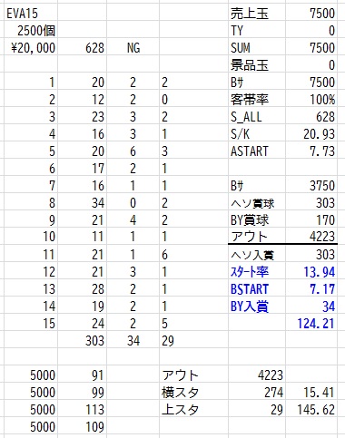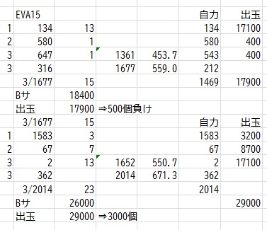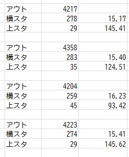 この台を打つのは4回目と書きました。御覧のように横良し、上悪しの傾向はずっと変わらず。お店の釘調整が安定してるってこともあるけれど、実際遊技した日は前日よりも釘を開けてた日ですから。割数を毎回一定にしてるという点で納得の数字。1回だけ全然回らなかった日があるけど、多分これは下ムラ。数字は毎回初っ端のBサ3750個だけを対象としてるので1日単位のものではないけれどここまで数字が安定するとは思わなかった。無論Bサだけで判断する人は15000円で何回転という分析しかできないので、細かいところまでは分からず何も見えてこないでしょう。Bサ当たりの回転数を回転率と思い込んでるような人達は