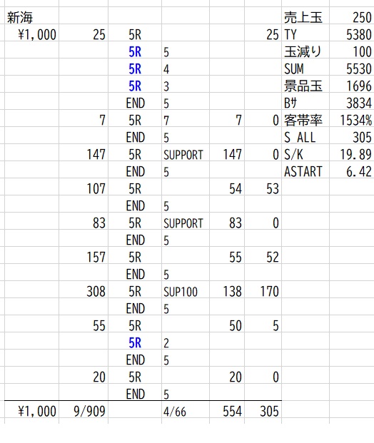 ST当たらずのあと7回転で今度は25回転時短の方で当たりましたけれど、これがまさかのスーパーサポートタイムに突入ということで今日はイタダキかな?160回転くらいで一発当たりそのあと107回転目に当たった奴がまたしてもスーパーサポートタイムに突入。ということでかなりついた展開から始まったけれど、それ以降はさっぱり。STの5回転で全然当たらんくなる。新海打つ時は深海モードでやってるけど、最初に魚群だけは信頼度100%にカスタマイズ。すると今日はボタンを押して魚群を期待って時にまるで魚群が出ない。15回くらいボタンを押す演出があったけど、魚群が出たのが1回だけという寂しい展開で