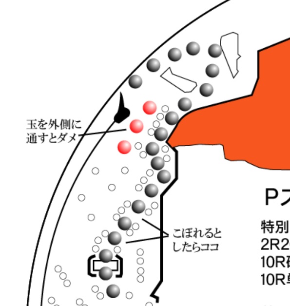 ゴム打ちをすると何割かの玉が、通過して欲しくない方に行ってしまうので肩の通過率が下がる可能性があります。そこでゴム打ちよりもやや弱めに右打ちすると、肩の通過率を損なわないで玉を落下させることができるでしょう。右から左に向かうルートの方が左から右に向かうよりも落下する速度が速くなる可能性があるかもしれません。万が一そのような物理現象が生じたら、電サポ中は左打ちよりも、右打ちの方が確変ベースが高くなる。やってみないと分かりませんがね。※ゴム打ち⇒右打ちで1番強くハンドルを振ること。盤面の右側グレイになってるところの最上部がゴムでできてたので、ゴムにぶつける打ち方をゴム打ちと言います。