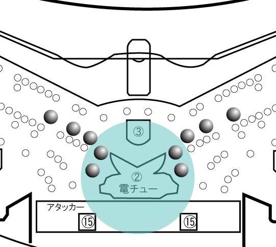 此度の沖縄は電チューの解放タイミングが一定ではない為に止め打ちの効果が少ないという声をよく聞きます。然しながらその実態は電解放タイミングよりも、元々電チューのハネが小さいことと、その横方向に広がる空間が広いから、玉が寄ってきても中に入らない事が多いのです。電チューが拾わないから玉減りをするというのが正解。だから止め打ちをしようが、強弱打ちをしようがお構いなしに玉が減る。技術介入はほぼ不可能なんです。