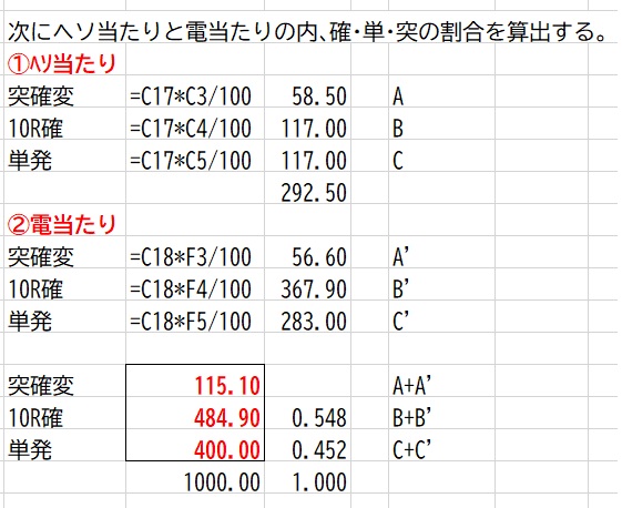 (2)ヘソと電とで異なる比率の時の実質的な確変突入率の計算方法