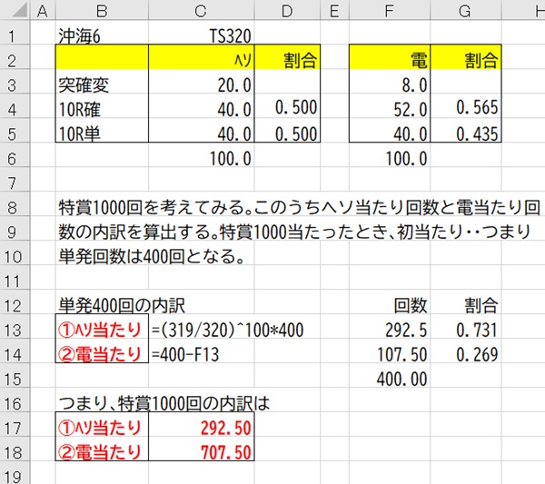 ヘソで当たった292.5回の内訳を凸20%,確40%,単40%で計算するとABCのようになります。