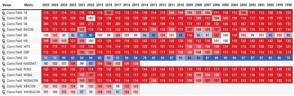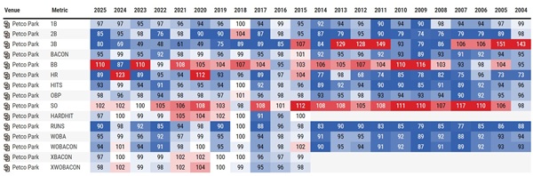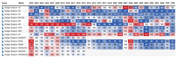 色赤いのが数値が高いこと。青いのが数値が低いことを示す。クアーズ・フィールドは奪三振以外はすべてが赤色である。超がつくほどのバッターズ・フィールド。三振は取りにくいけど、ヒット、2塁打、3塁打は本当に出易い。その下がペトコ・パーク。対照的な投手有利の球場である。ここでは三振だけが赤で其れ以外は青である。その下がドジャースタジアム。今では本塁打が出易い球場となっているけどちょっと前までは、本塁打さえ出難いピッチャーズ・フィールドだった。2010年代の後半から本塁打だけが真っ赤に染まる。