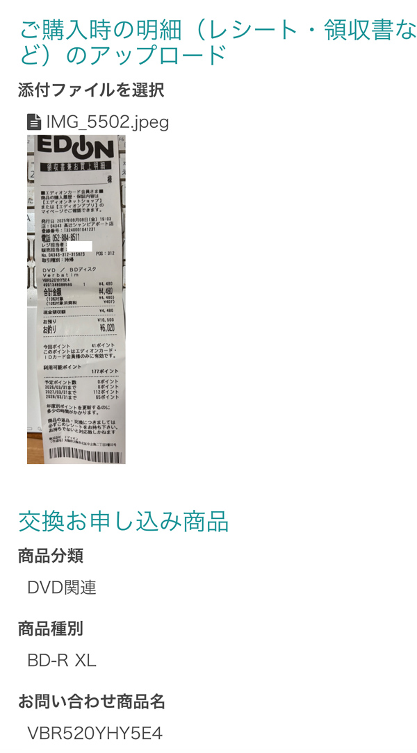 領収書を撮影してこの画像ファイルを添付して必要な項目を埋めていきます。名前、住所は勿論のこと上記の商品種別とか商品名を埋めてお申し込みフォームを完成させました。2、3日後にはメーカーから電話かメールが来るということだったのでしばらく待ってたのですが