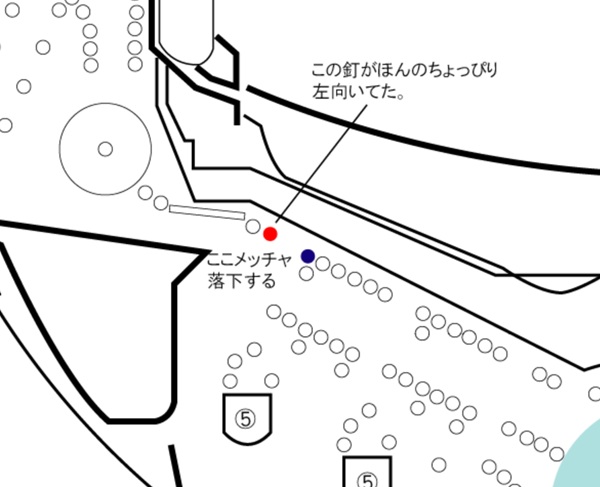プラ板の長さは短くなっています。パッと見、これで多少改善したかな?って思ってたんですけどさに非ず。板のすぐ右横に大きな落とし穴があるために甘いゲージとは言えませんね。この落下穴は結構厄介で、実践でもここに落ちる玉はかなり多かったし、其れを更にマイナス調整しちゃったら全然回らんくなっちまう可能性もある。