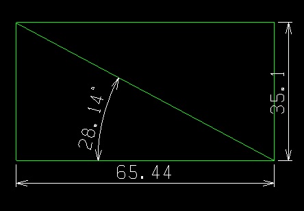横が65.44mmで縦が35.10mmでした。これをEASYDRAWで寸法線を引くと28.14°という数字が出ました。誤差あるから28度として考えていますけど28度は過去の遊技機に照らすとまあまあの角度と思います。もっと勾配が強くても良いかなって思うけど28~28.5度くらいがちょうど良かったと記憶しています。これをEXCEL関数で求める場合は以下のように入力します。基本EXCELのアークタンジェント関数はラジアン値を返しますので、其れをDEGREEに換算するってことですね。Degreeは「度」を表す言葉。ラジアン0.492を度に換算すると28度になるってこと。