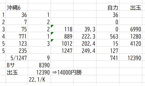 ぼちぼち沖縄でも勝ちに行かんと行かんけどと思いながら、確実に回る沖縄の島に来た。最近この店の肩は台によってだいぶ違うので面白いなと思いながらやってる。沖6の横スタ抜群に良いなってことに気が付いたので、それでいて上が良い奴を見つければお宝台かって思って出陣。いつものように肩の通過率を数えると最初の1000円で104/319と来た。だいぶ肩入るわ。あんまり玉が減らん鴨ねって思った瞬間36回転目にワリンの泡が444で止まりやがった。単発。