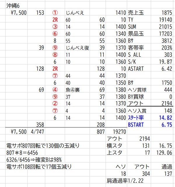 私は今日ならやれると思った。肩の調整が悪い店ではやらないこともあるんだけど、今日は「やる」一択だと思ったよ。玉減らんじゃない?って思いながら勝負開始だ。肩の通過率は思った通り抜群で1/2.22。素晴らしい。ところが横スタが覚束ないのでこのまま勝負を続けるか、止めるかの選択に迫られる。7500個投資とか10000個投資ってのは無理だなって思い始めた時、タコのリーチでジンベエの登場。沖縄6になってから絵柄当たりはジンベエからのボタン押しか、保留変化しかないぞ。ここでは見事にけたたましくやって確変当たり。してやったりだ。さあ直撃を狙おうか。