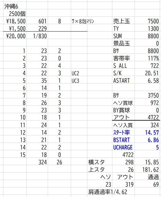 そういう見方をすると上記OUT27080個のデータは約1日分のデータという事が分かります。自力2000でスタート率が14.0ならアウト玉は28000個となります。BOが28000個でTOが22000個。これで終日稼働のアウト5万個になるでしょう。という事はウリンチャージの当選確率はアウト玉に対して11/27083ですからアウト2462個につき1回ですか。其れによって得られた回転数が39回なので、沖縄6を終日打つと1日に40回転くらい電サポで抽選できるってことですよね。