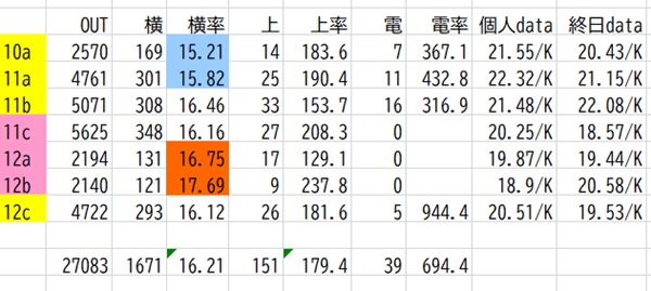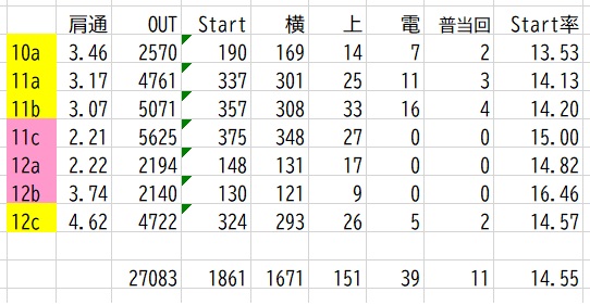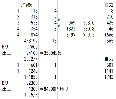 こうしてみると沖6の上スタはかなり性能が悪いですね。この日もずっと上に注目してたけど、窪みが小さすぎて入らない。だからこそ上が伸びないのですがこの辺が沖6の限界。1回だけ上129.1ってのがあったけど其れ以外は180前後。概ね沖縄6の上スタは180と思ってれば間違いはなさそう。そうすると横は相当良くなければ打つのは難しい。