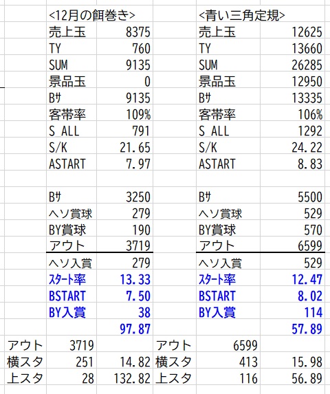 青い三角定規とは玉道場ABC豊川のことね。パチンコやるなら「勇気をもって遠くまで飛び出せ」って意味で「飛び出せ青春」を連想し、その主題歌「太陽がくれた季節」を歌っていた歌手グループが青い三角定規。わーさん関係のイベントでは等価で24.22/Kが出るけどその時でさえ横スタは15.98しかなかった。あの日はワープ入口をぶっちぎっていたからステージをころころ転がる玉が多くて窪みに入ってのヘソ入賞がグンバツ。ポケットも今日よりかは良くて元ゲージに近い入賞率。だからこその数字ですが、本日の遊技台は上スタとポケットは悪いけれど、横スタは素晴らしい。如何に今日ヘソを開けたかが分かるというもの。こんなにヘソを開けるイベントはないのでここに来た甲斐があったけれど、私が普段打ってるエヴァアス。19/K程度の台では横スタは19くらいまで落ち込むからね。