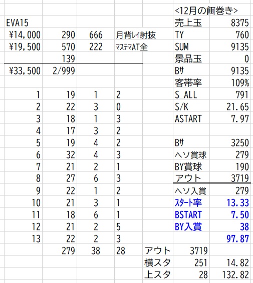 並んでる時に今日はヤバいと確信したけれどクジ運よく全体の1/6くらいの番号。中に入ると昨日過去履歴をみてたエヴァアスの釘を見てたら、エクセルの若いおねえちゃんが、角番が開いてるよと私にのたまう。えって思ったけど、今日はそういう日なので釘をみると開いてるわ。こっちの方にしよう。昨日まで考えた過去履歴の検証はぶっ飛んで、過去履歴を無視して釘の開いた台に陣どる。