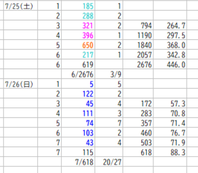パチンコ三洋時代に戻れるものなら戻りたいと思いましたが、あの頃は15kmという道のりでさえ遠いと思っていたのですが今では軽く50km程度の道のりでも難なく走っていくわけですから時代も変わったよなあと感慨深いのであります。今の私にとっては15kmなんてのは庭先みたいな感じ。いっやー本当に先週の土日は距離のハンディみたいなものを感じましたね。それにしても土曜日のデキならば、今までだって何度も2日連続遊技にトライしてますけど、あのような特賞間回転数履歴からは翌日のドカンは経験した記憶がないだけに、いくら何でも朝イチ500円で27連発は勘弁して頂きたいところです。7/26の遊技結果は自分が勝手に、時短中にも引き戻してるはずと思って3回ほど時短当たりを想定していますが、時短中に当たる当たらないに関係なく27発は事実なのでとんでもない当たり方でした。よく見ると、前日も自分が止めた後219回転の消化だけなので、もしかしたら土曜日の段階で間にあってたんじゃないかなってことになるけれど、アクセル踏んだつもりでも限りなく踏み方が弱かったというお話ですね。