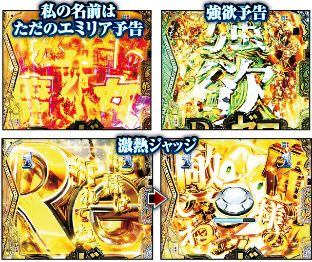 3大演出はいずれも信頼度70%OVER。強欲予告はSPリーチ発展直前にエキドナが降臨する演出で、激アツの強欲SPリーチへ。私の名前はただのエミリア予告は、変動中やリーチ後のボタン押下から発生する激アツ演出だ。激熱ジャッジはSPリーチ中の最終局面で発生する強力なチャンスアップ。特に死に戻りSPでは出現の有無が当落を分けるので要チェック!