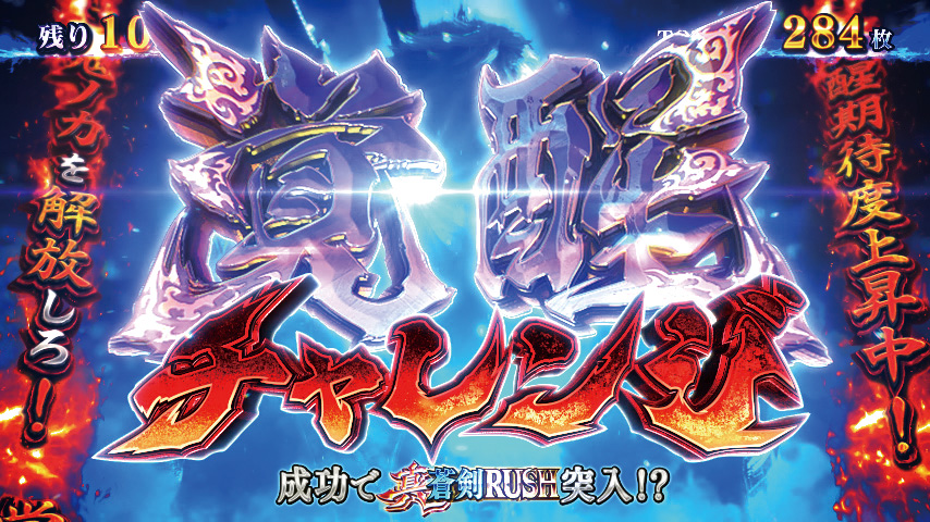 上位AT「真蒼剣RUSH」に突入すると1G純増が約5.5枚にアップ。ゲーム性はAT「蒼剣RUSH」と同じで、ゲーム数上乗せありのセット継続型です。継続率は89%。ボーナスループ率もアップし、最大86%でボーナスループも期待できます。